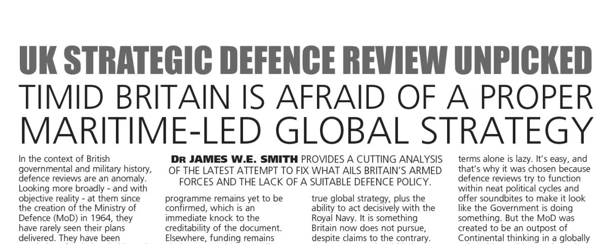 In the August 2025 edition of Warships International Fleet Review, (on sale in e-version and print in the UK & abroad after 18 July 2025) I analyse the recently published UK 2025 Defence Review document. I continue to advance the argument 'strategy is dead' and defence organisation isn't working